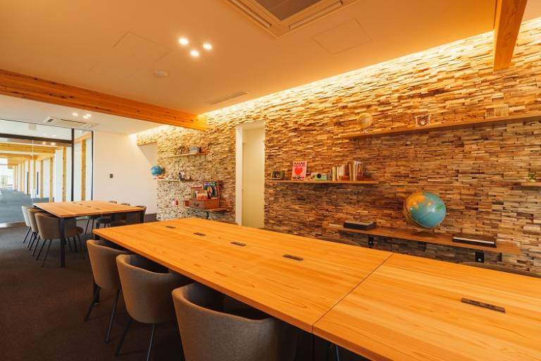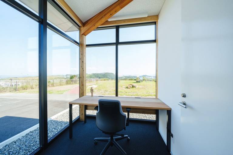 建物は紀州材を使用した木造建築で、木の温もりを感じつつ、空港滑走路やアドベンチャーワールドを眺めながら、リラックスした雰囲気で仕事ができる環境です。また、施設の外を一歩出れば太平洋も一望できます。
