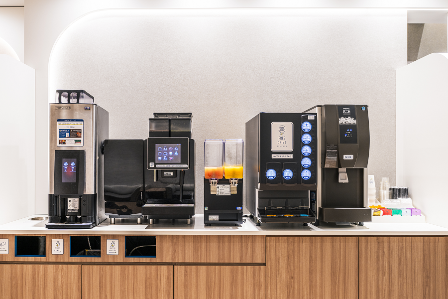駅近で天井が高く明るく開放的な空間。ドリンクサービスも充実。
