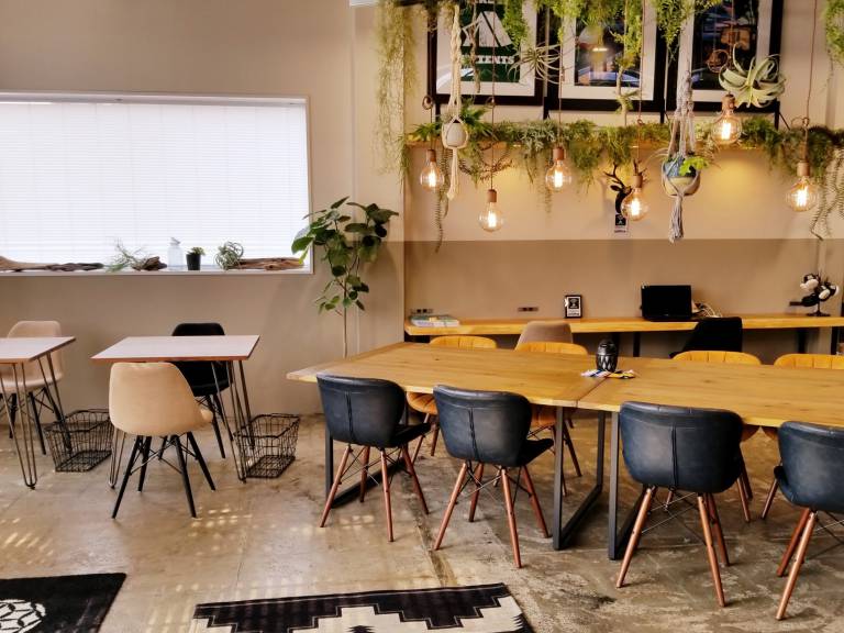 JR鳥取駅北口より徒歩3分、ホテルレッシュ鳥取駅前1Fのコワーキングスペースです。東面全面ガラス張りの日当たりの良いオープンスペースが広がります。リモートワークに適したソファー席や資料の広げやすいテーブル席、集中しやすいハイチェアーのカウンター席を提供。スマホ充電器、荷物置き、フリードリンクもご提供。ホテルフロント奥に入口があり、夜間のご利用も安心です。