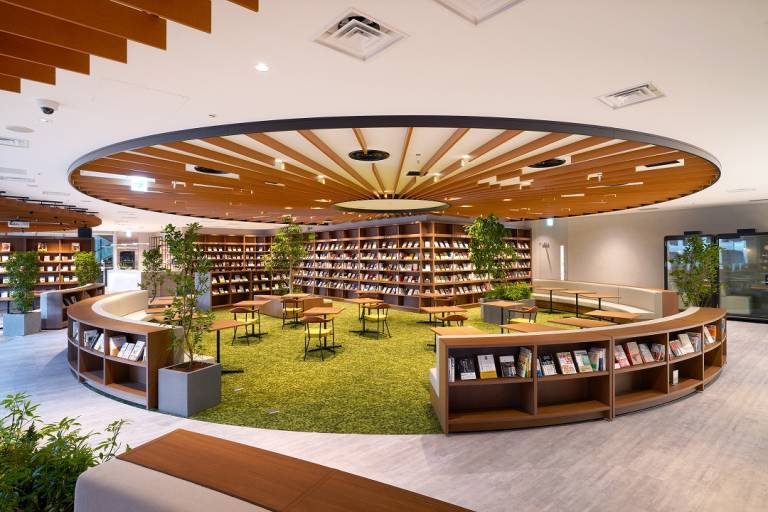 約3000冊の書籍と沢山の植栽に囲まれたブックラウンジです。ワークスペースとして、読書を楽しむラウンジとして、落ち着いて集中できる空間です。茅場町駅の直上、日本橋から徒歩5分と抜群のアクセスで、まさに都会のオアシスのようです。