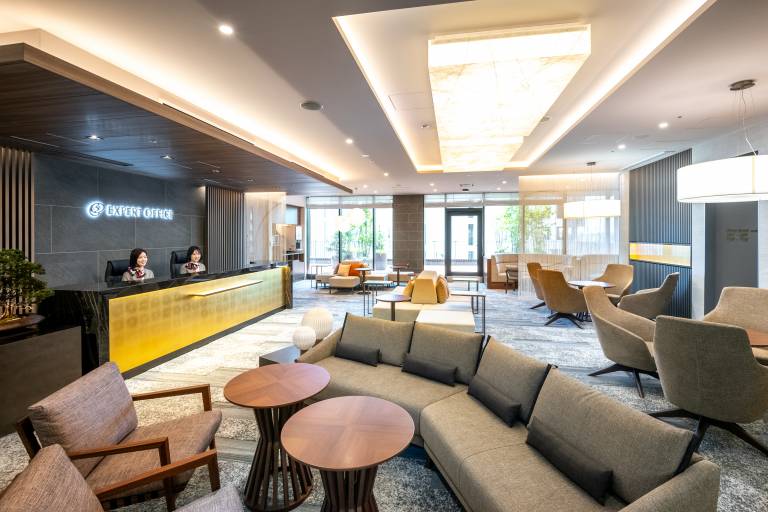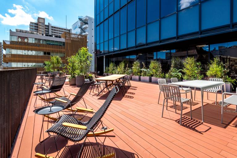大型のテラス付きのラウンジは高級ホテルを思わせる落ち着いた空間。コワーキングスペースにも専用テラスがあり、静かな落ち着いた空間です。