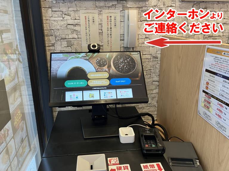 ①1F店舗入り口精算機の上にあるインターホンでスタッフに「OFFICE PASS利用」の旨ご連絡ください。スタッフが二次元コードPOPをもって参ります。