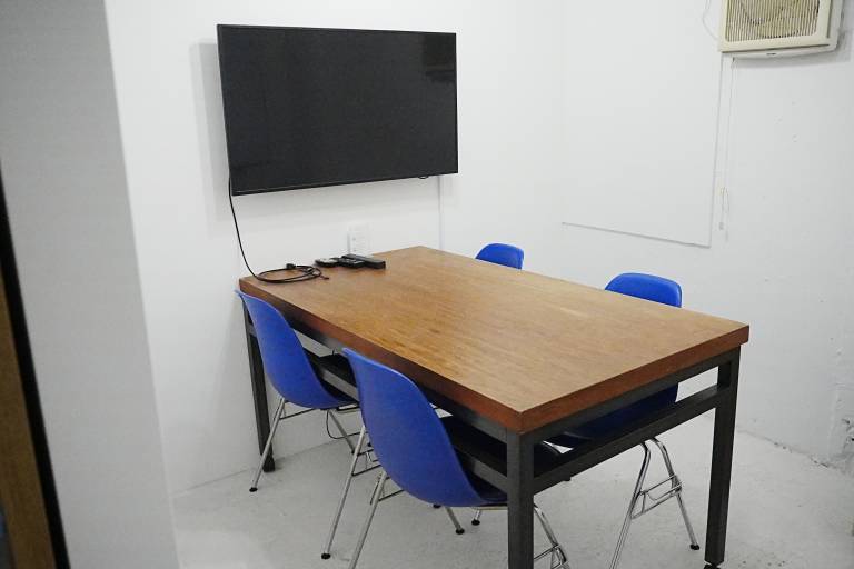 大画面モニターとホワイトボードを備えた会議室も利用可能(有料)で、ミーティングやプレゼンにも対応しています。