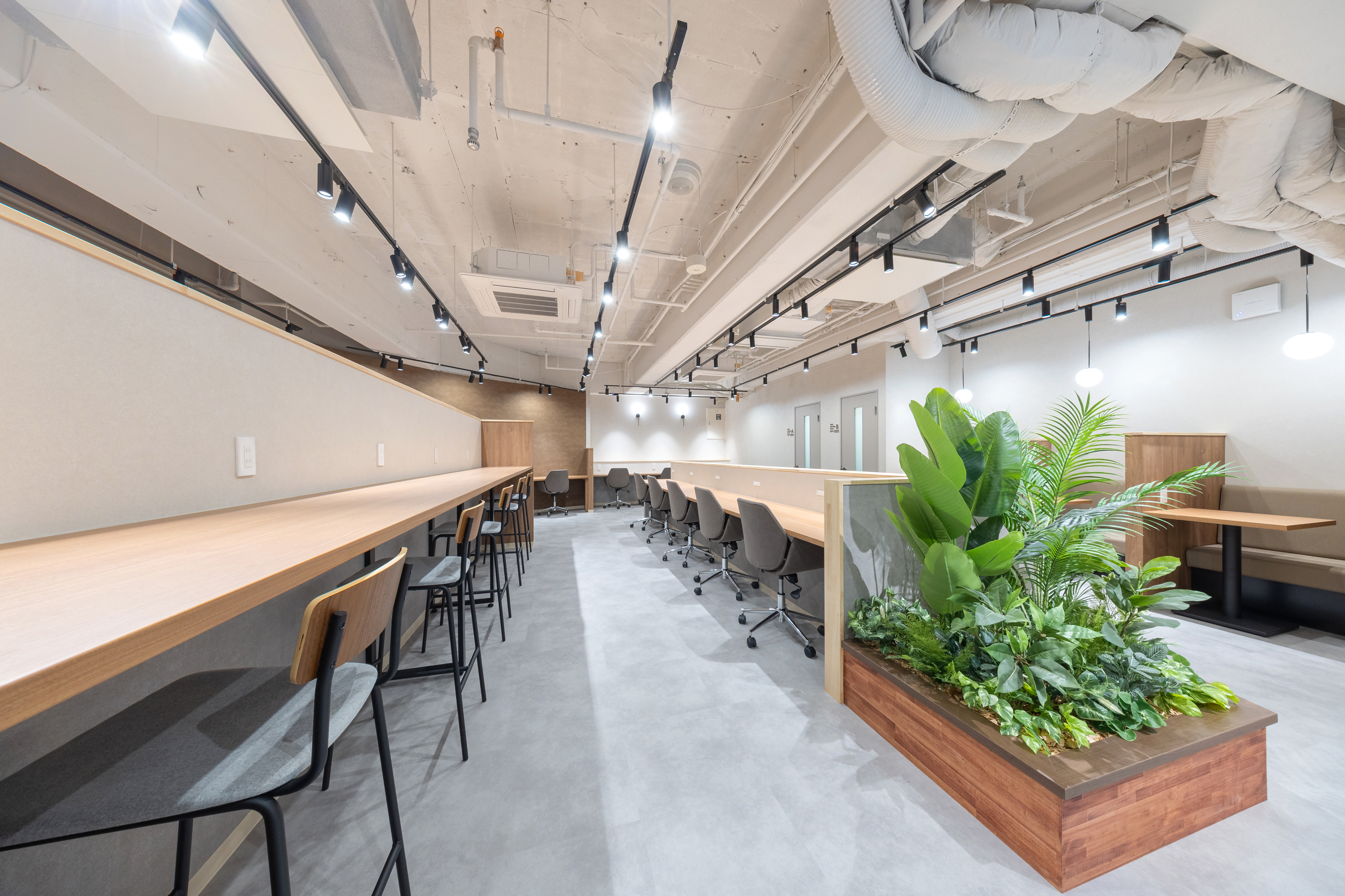 高速Wi-Fi、フリードリンク、各席電源、無料プリンターなど設備も充実!食事やWEB会議もできるカフェブース、しっかり集中できるワークブースと、用途に合わせてゾーニングされているため快適です。